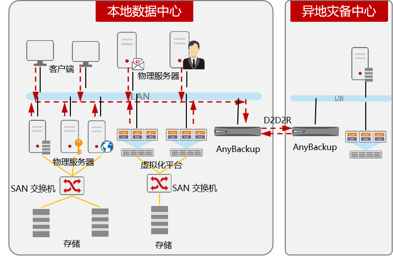 • 分支部署AnyBackup备份一体机或备份软件,完成本地备份和备份数据向中心的复制